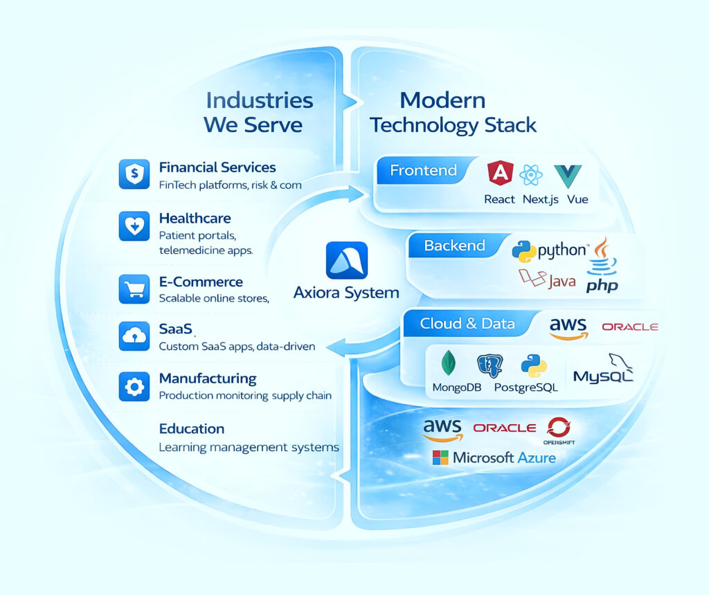 Axiora Systems partners with enterprises, financial institutions, healthcare providers, SaaS companies, and nonprofit organizations to modernize complex systems and build secure, scalable digital ecosystems.